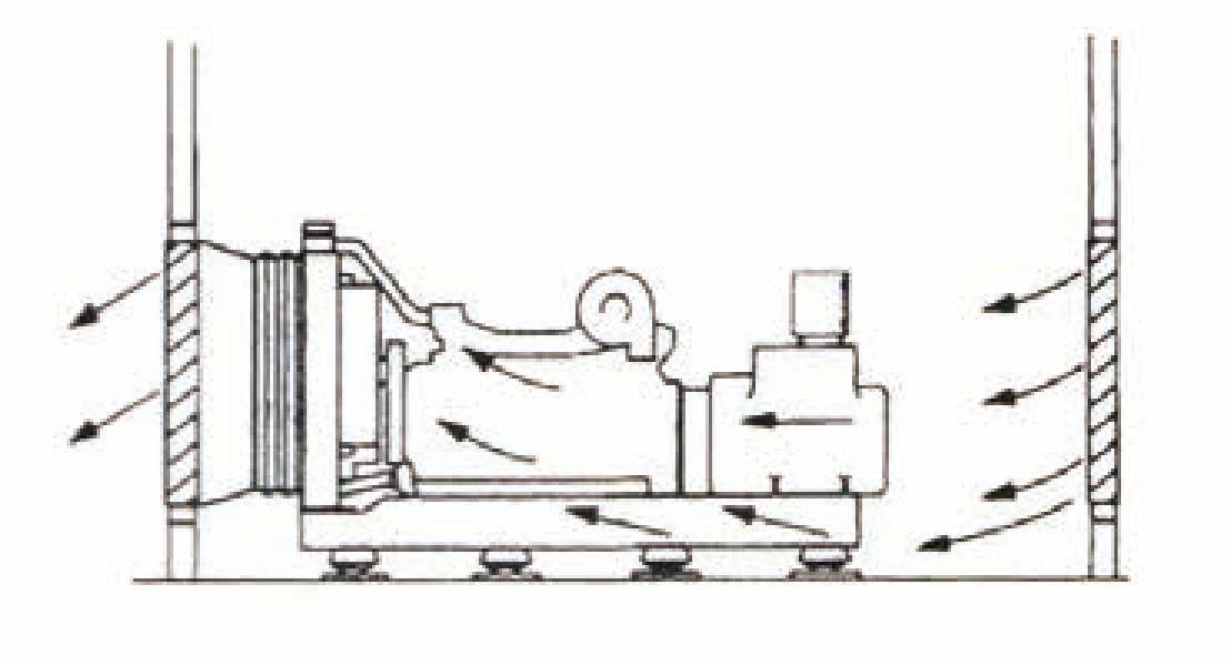 На рисунке справа показано идеальное расположение генераторной установки и стены машинного отделения. Его цель — получить холодный воздух из самой нижней точки, протолкнуть его через ребра радиатора, а затем вытеснить из машинного отделения.