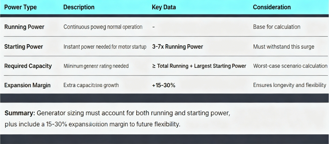 Учитывайте пусковой ток: пусковой ток для индуктивных нагрузок, таких как компрессоры кондиционеров и водяные насосы, может в 3–7 раз превышать их рабочий ток. Генераторная установка должна выдержать этот мгновенный удар.